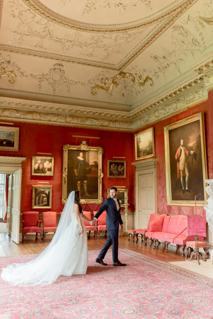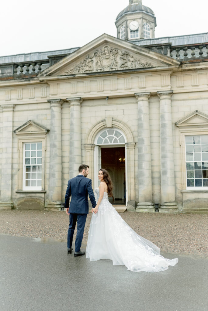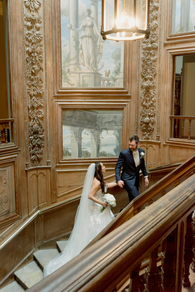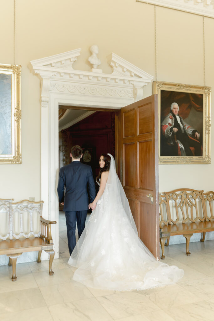 Even when weddings take place primarily within the estate’s event spaces, couples are often able to access selected areas of the main house and gardens for portraits. This allows the historic architecture and surrounding landscape to become part of the visual story of the day.