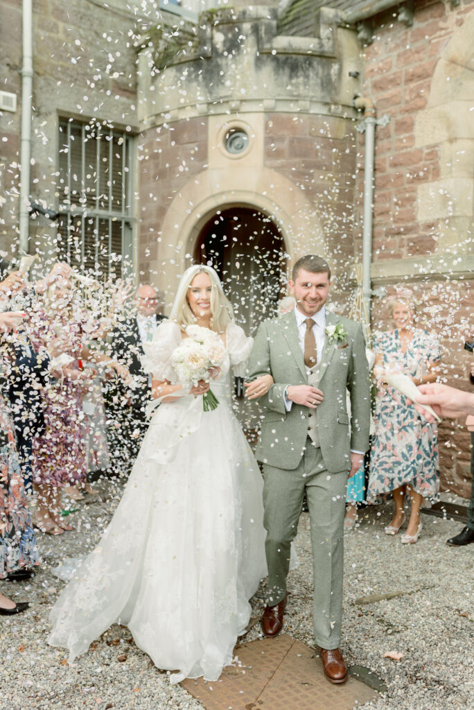 Lucy wore a custom Alena Leena Bridal gown with the softest flowing silhouette, delicate textured detailing, and whimsical bubble sleeves — found via The White Closet UK in Manchester. George’s soft green tweed suit by Squires Outfitters was the perfect complement — echoing the tones of the Scottish countryside and the relaxed elegance of the day.